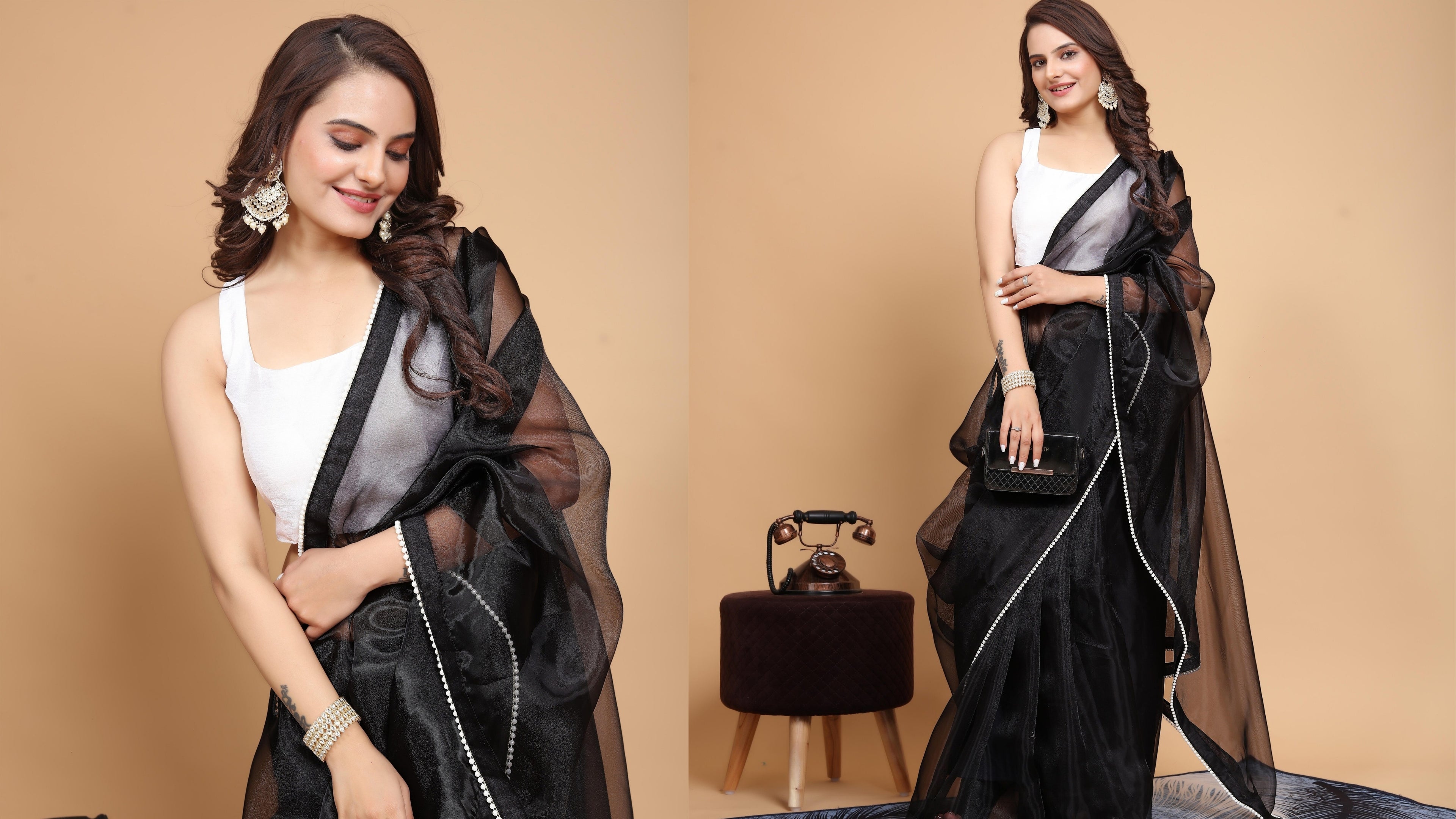MK WOMEN'S Latest Ethnic Wear Georgette Saree Solid Pattern With Handwork Border Saree With Blouse Piece In Black Color Pack Of 1.